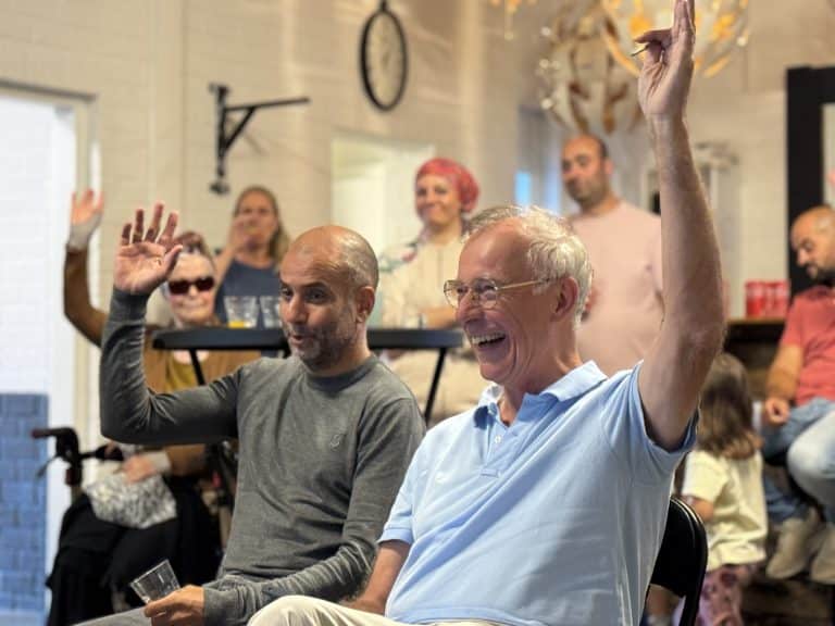 De eetruimte van Nieuw Kerkelanden zit hartstikke vol met buurtbewoners en bewoners van de woonzorglocatie. Ze luisteren geboeid naar bewoner…
